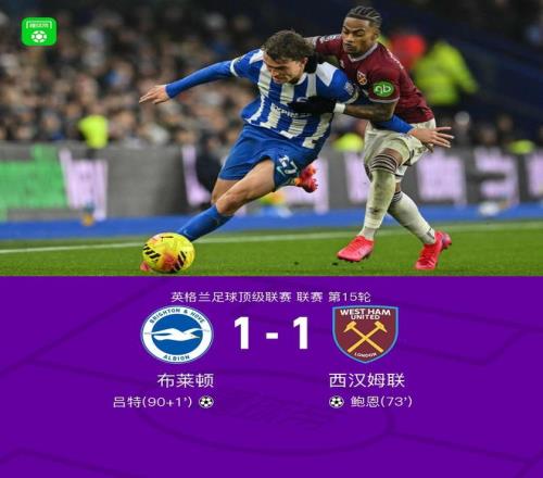 北京時間12月7日,英超聯賽第15輪,布萊頓坐鎮主場迎戰西漢姆聯。上半場,帕奎塔遠射造險;下半場,威爾遜助攻,鮑恩倒地情況下小角度破門。隨后,呂特亂戰中小角度破門扳平比分。費布魯亨屢獻神撲。最終雙方1比1握手言和。